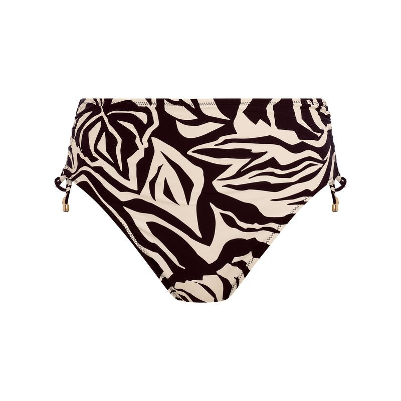Embrace summer with the Aruba Nights High Waist Bikini Brief in black and cream. Featuring a unique geometric print inspired by tropical palm leaves, this brief offers medium coverage and a flattering mid-rise fit. The gold metal ring detail adds a subtle touch of elegance, while the fully lined fabric ensures comfort and confidence all day long. Perfect for standing out stylishly by the water.
