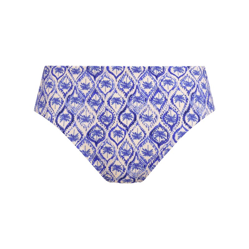 Embrace summer with Freya's Ocean Breeze High Waist Bikini Brief in a serene Denim shade. The blue palm print on a crisp white background evokes warm Mediterranean vibes. Designed with a high-rise waist and scoop leg line, it offers a flattering shape and medium coverage, providing confidence and comfort for poolside or beach days.