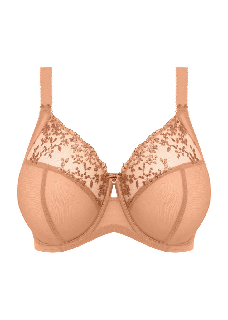 Discover effortless elegance with Elomi's Zarla Stretch Banded Bra in Café Au Lait. This mid-coverage style features delicate abstract leaf and berry embroidery in flat stitch across the top cups, paired with a charming centre-front bow. The non-stretch top cup delivers enhanced support while the three-section cups with side panels create forward shape and uplift. A tall chimney back smooths your silhouette, while tulle cups with sheer lining offer a light, flirty aesthetic. Double-layer wings with encased elastics ensure soft, seamless edges. Available up to K cup.