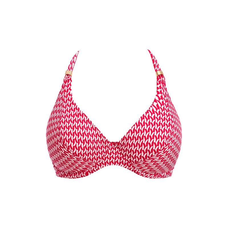 The Koh Lipe Underwire Halter Bikini Top in Radiant Red combines style and support effortlessly. Its plunge neckline and lined cups offer flattering shape and comfort, while the halter neck scarf tie adds a chic touch. Finished with elegant metallic gold trim, this bikini top enhances your swimwear look with confidence and ease.