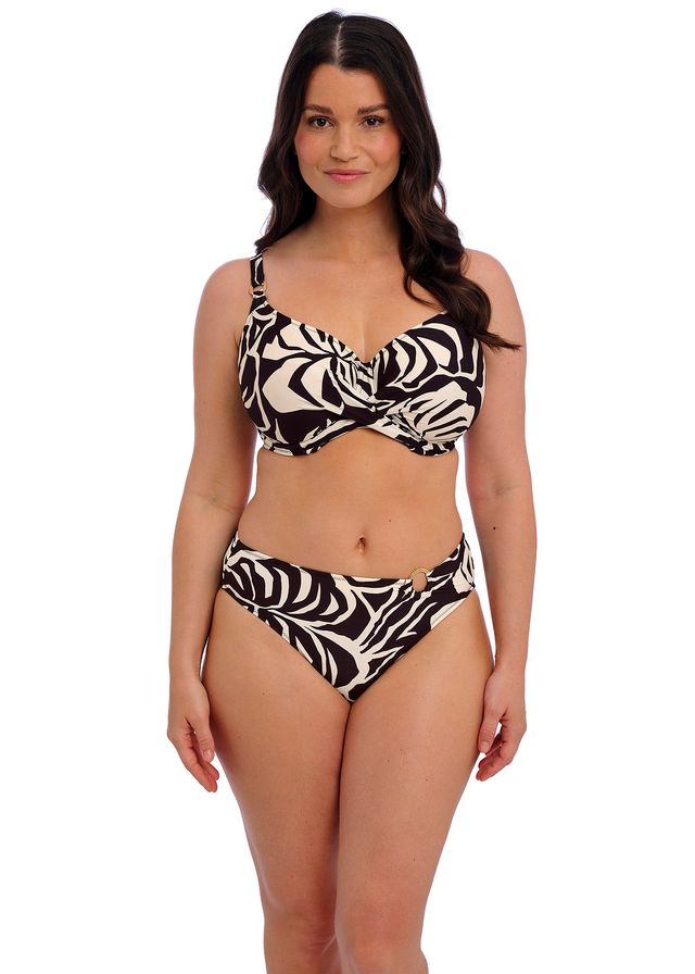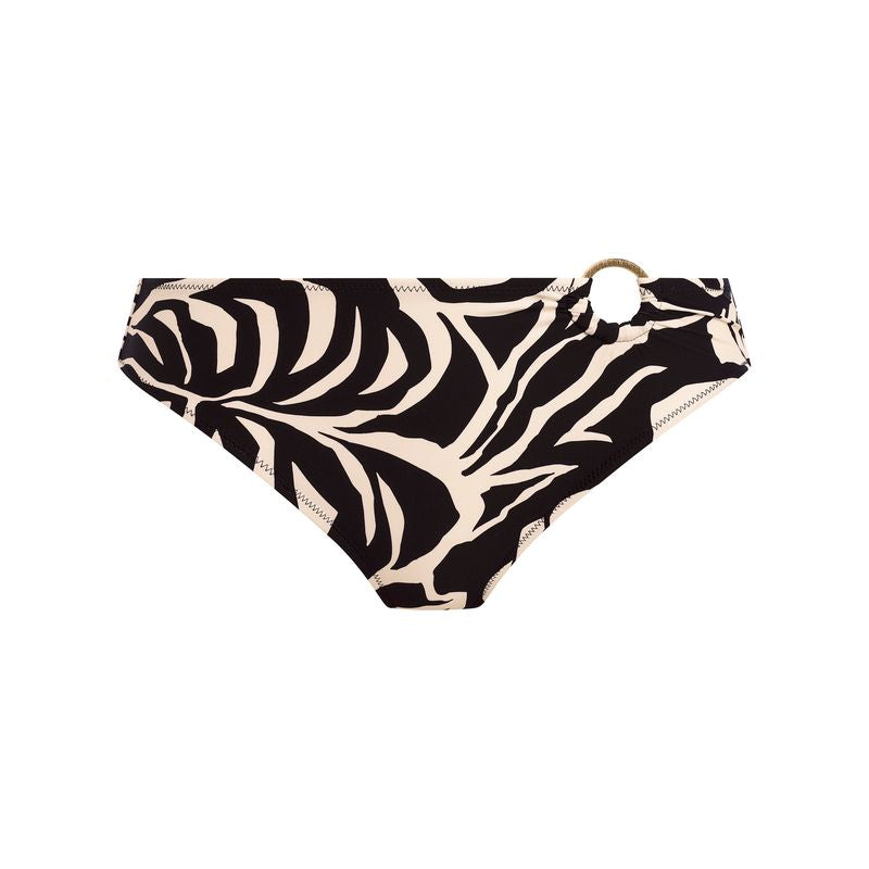 Embrace summer with the Aruba Nights Mid Rise Bikini Brief in black and cream. Featuring a unique geometric print inspired by tropical palm leaves, this brief offers medium coverage and a flattering mid-rise fit. The gold metal ring detail adds a subtle touch of elegance, while the fully lined fabric ensures comfort and confidence all day long. Perfect for standing out stylishly by the water.