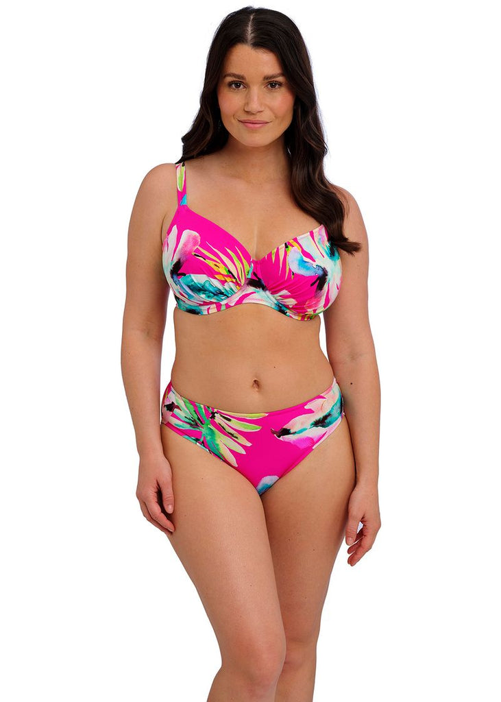 The Carabelita Mid Rise Bikini Brief in Peony showcases an exclusive Italian watercolor print inspired by tropical travels, with painterly jungle leaves on a vibrant fuchsia pink base. Designed for comfort, its mid-rise cut provides medium coverage, and the fully lined fabric ensures a smooth, supportive fit throughout your day.