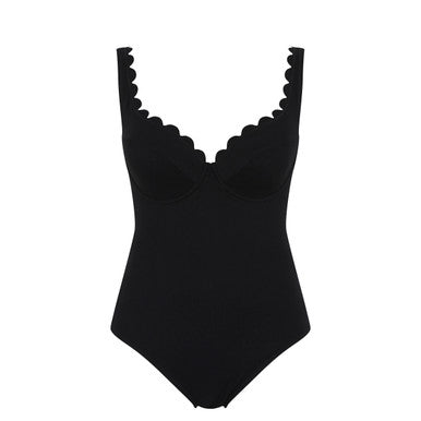 Introducing the Spirit Rita Plunge Swimsuit in Black from the Panache Swim collection — where timeless elegance meets modern comfort. This stunning one-piece features a daring plunging neckline that exudes glamour, paired with delicate scalloped edges for a playful, refined finish. Crafted from luxurious Spanish fabric with a knitted honeycomb texture, it's as beautiful as it is durable. Designed with wired, non-padded construction and lower-sitting wires that create the perfect plunge while minimizing coverage, this swimsuit celebrates confidence and curves. The inner powermesh liner delivers medium tummy control for a smooth, flattering silhouette without sacrificing comfort. Whether poolside or beachside, the Rita Plunge is your go-to for effortless, classic chic.