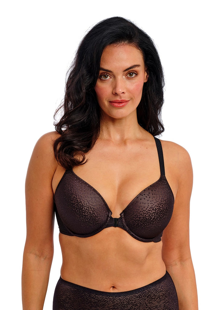 Experience smooth confidence with the Back Appeal Moulded Bra in Black. This front-fastening bra offers full coverage through supportive stretch foam cups adorned with elegant dot jacquard fabric....